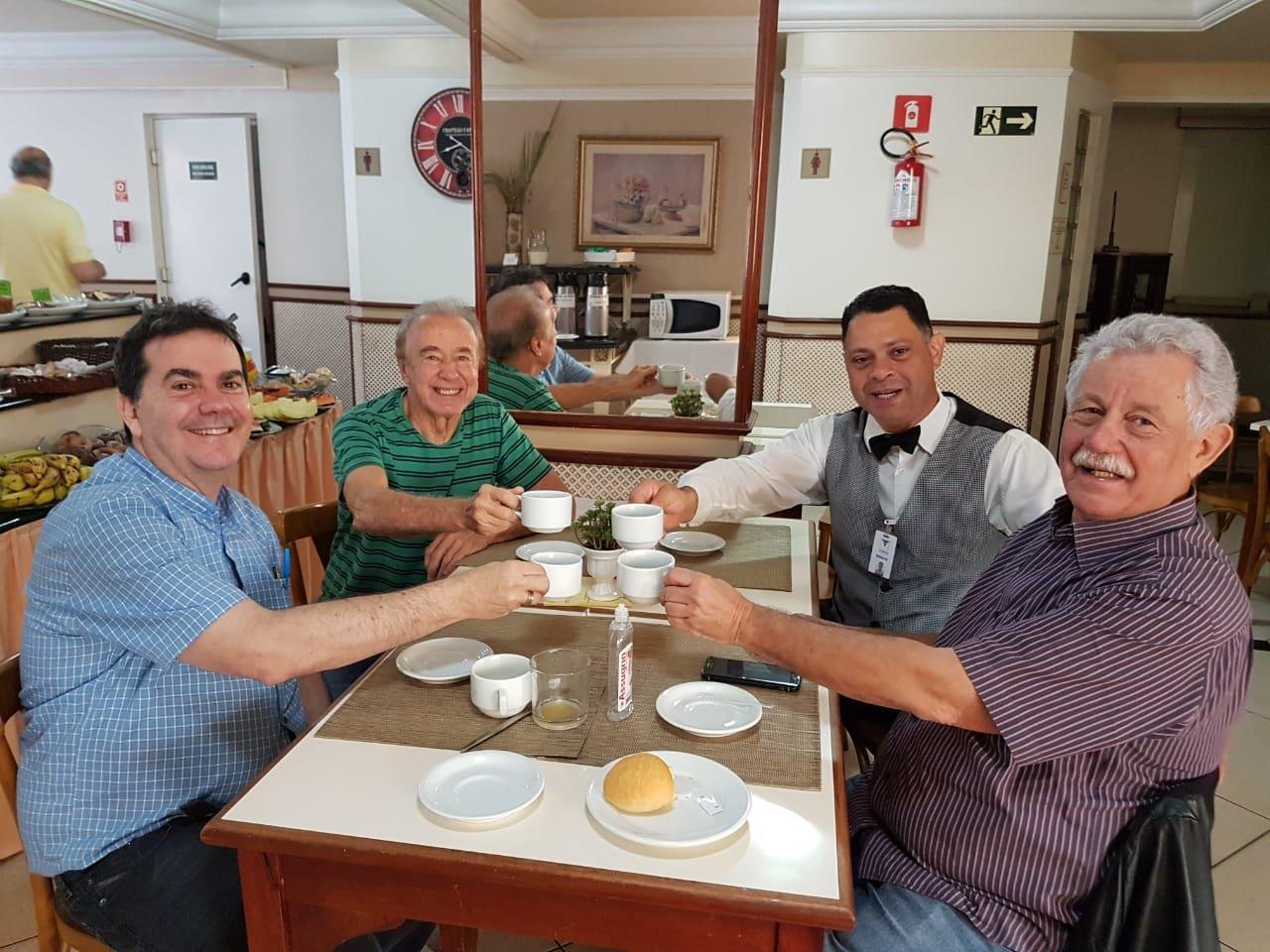 Silvinho Rodrigues da Cunha, simpático proprietário dos Hotéis Tamareiras, recebe os amigos advogados Públio Rocha e José Afonso Bicalho para o café da manhã mais famoso de Uberaba, com seu maitre Renato.