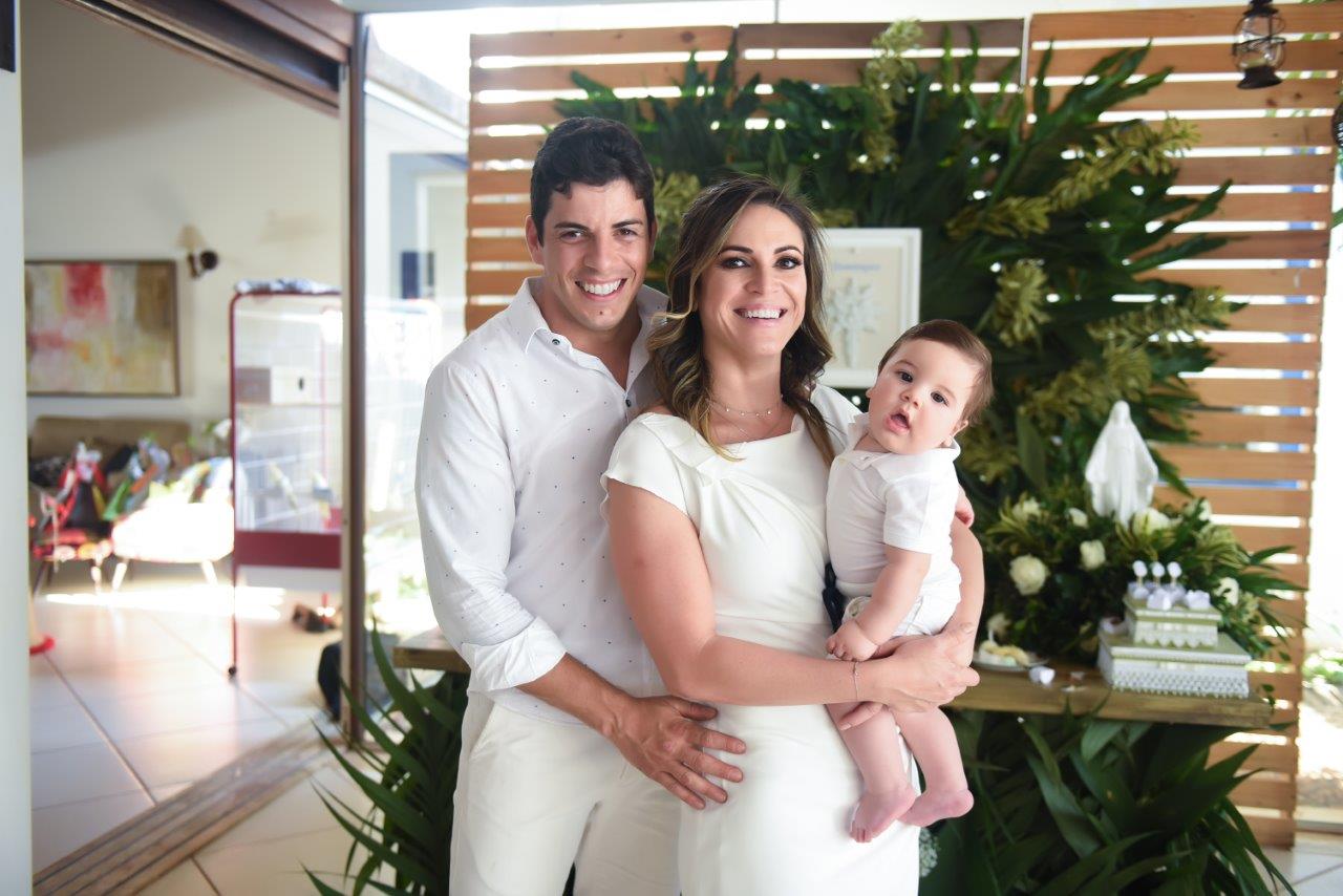 Marcela e Gustavo Bessa receberam seus convidados em sua residência para comemorar o batizado de Domingos Augusto Cadelca Bessa e o aniversário dela no mesmo dia.