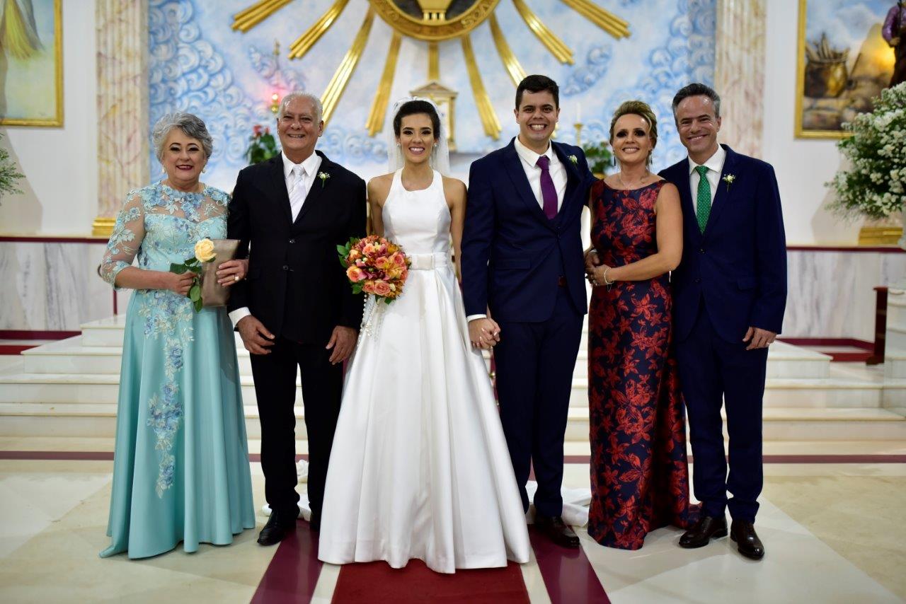 Vanessa e seus pais Marisa e Luiz Carlos e Vinicius com os pais Fabiana e Roberto Vagner Mendes em emocionante cerimônia de casamento na Medalha no dia 8