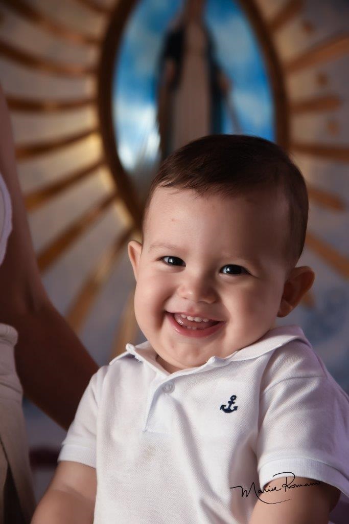 Com muita alegria, Davi Ribeiro Sbroia comemorou o sacramento do batismo com um sorriso lindo e a bênção de Nossa Senhora da Medalha.