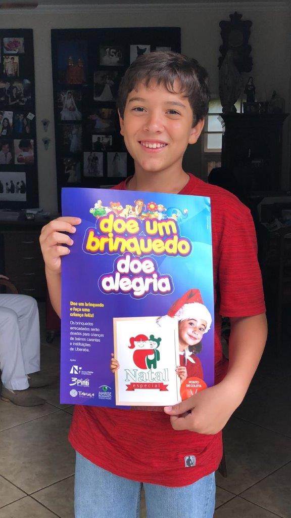 Bruninho Teixeira exibe o cartaz da campanha que está empolgando os empresários para o recolhimento de brinquedos que serão doados a crianças carentes no Natal.