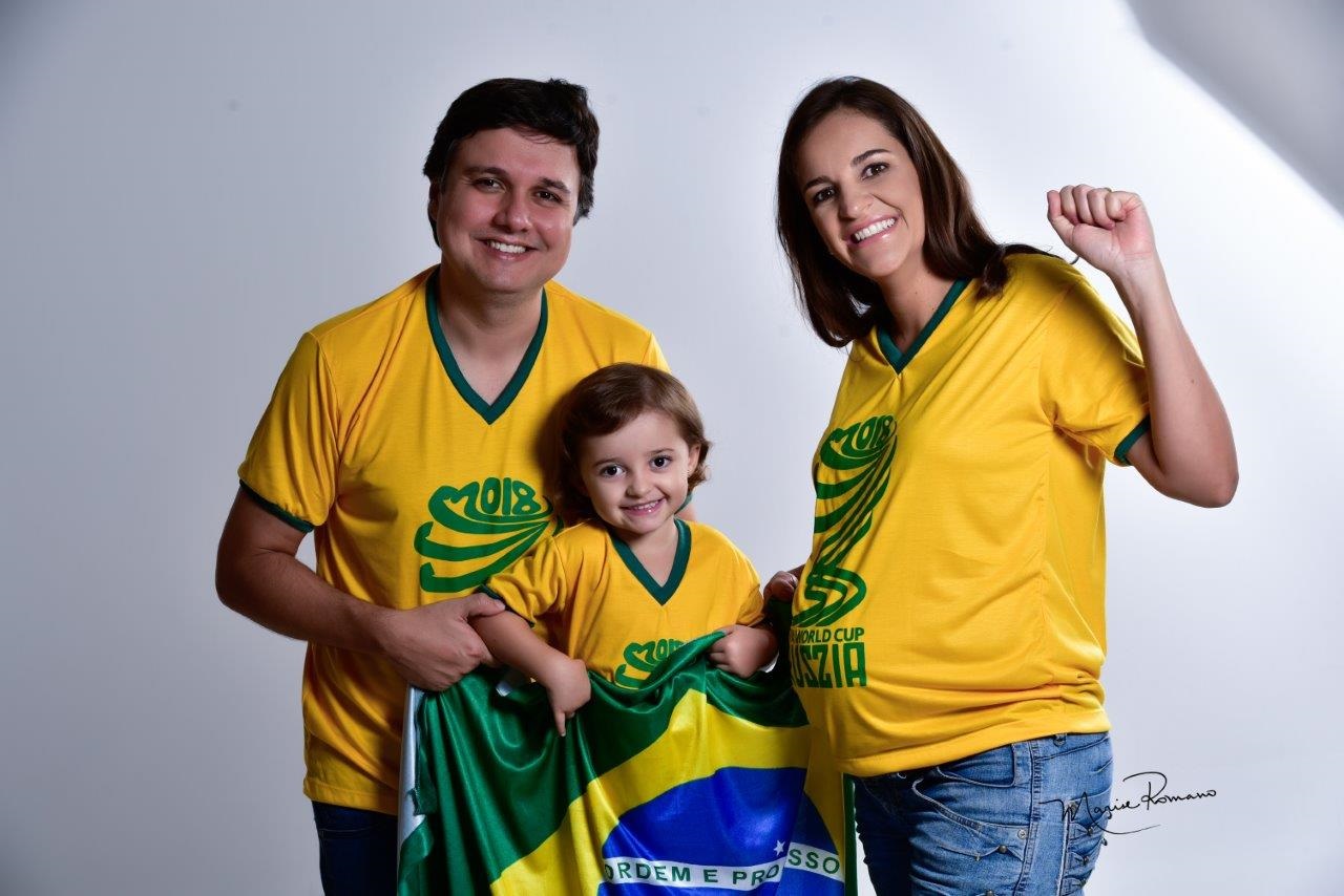 Em clima de Copa do Mundo, Emerson e Flávia com a filha Giovanna. Família espera por Larissa para o próximo mês