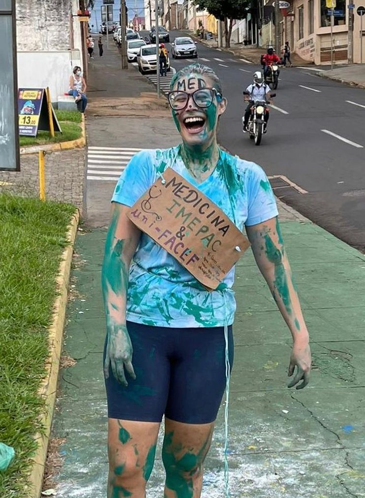 Manuela Pereira ganhou ovada ontem dos amigos para comemorar o sucesso no vestibular de Medicina!