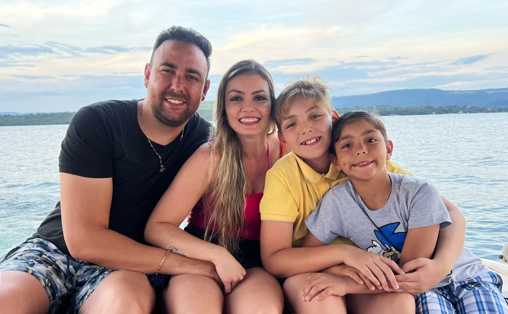 Jessica e Bruno Mendes se divertiram muito ao lado dos filhos Caio e Gabriel na virada do ano, em Rifaina