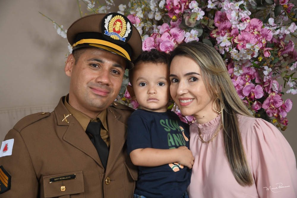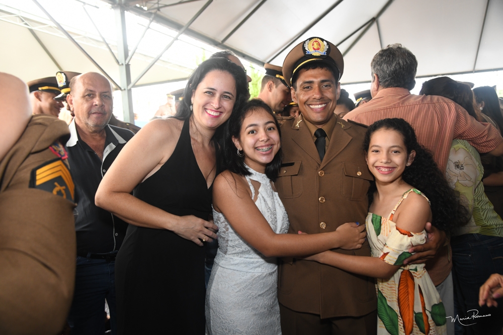 Robledo Ferreira da Silva recebeu sua divisa de sargento da Polícia Militar pelas mãos da esposa Jusceli e do filho Lucas Gabriel