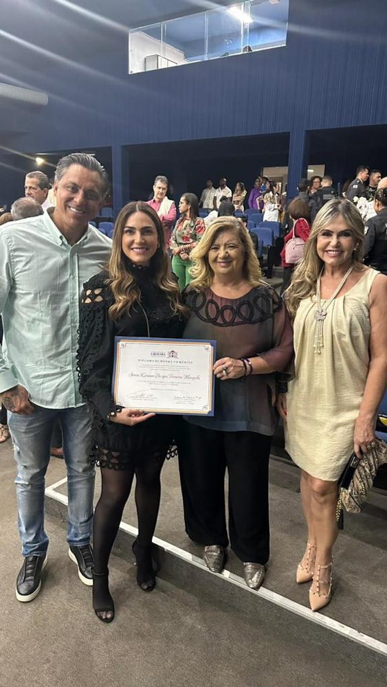 A dinâmica e linda digital influencer Kaká Borges recebeu homenagem da Câmara Municipal, pela vereadora Denise Max, ao lado do marido Shampoo e da mãe Sônia.