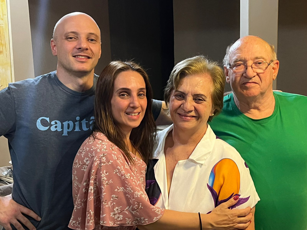 Vera, Fernando Angotti e Fernanda abraçaram o advogado Eduardo Marega Angotti pelo aniversário feito no dia 29 de julho