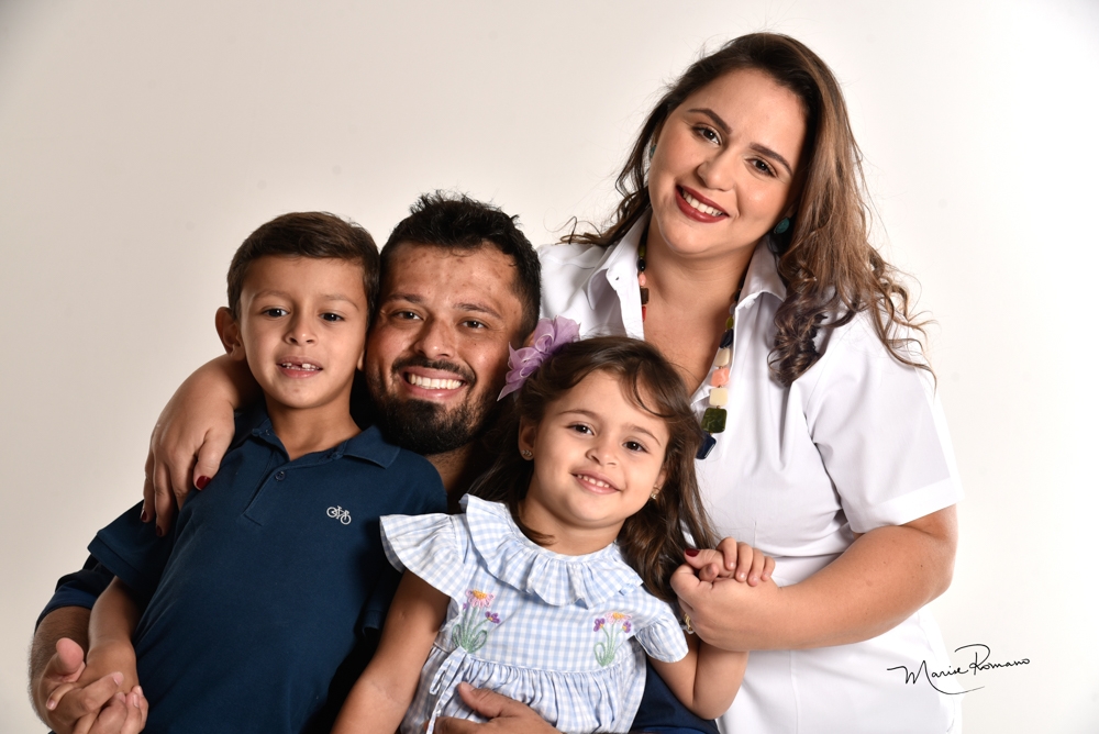 Roseane Bueno Bruno com o esposo Heitor Cobo com Bernardo e Cecília em clima de paz e amor. Ela é massagista formada pelo método Renata França..