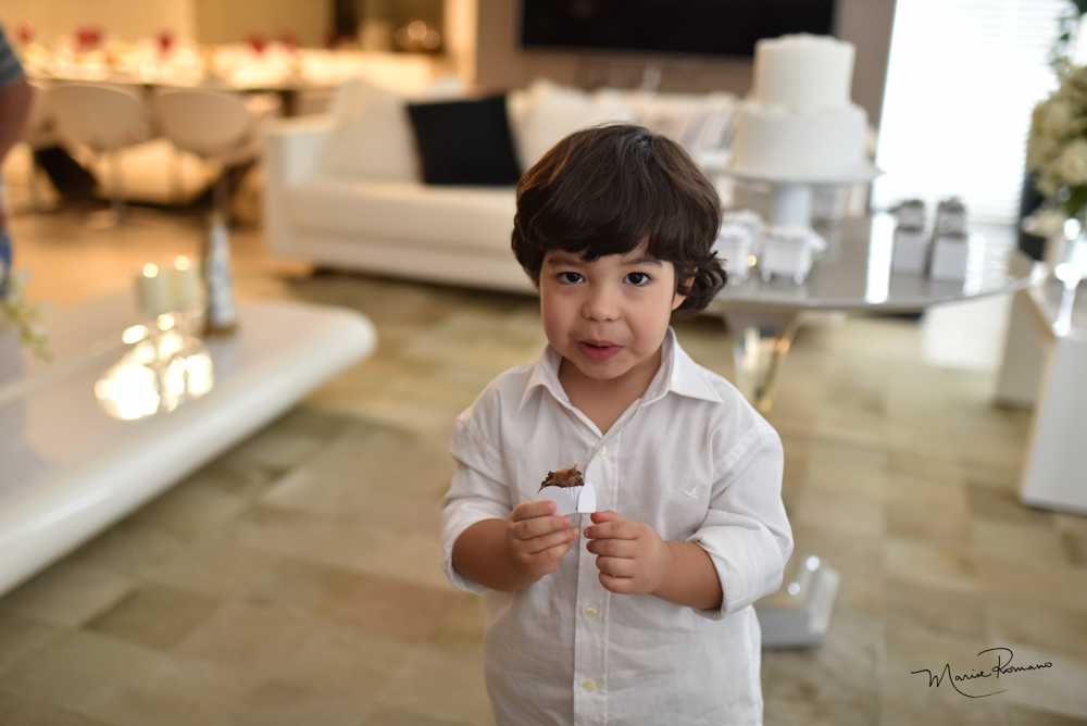 Bernardo Rocha Idaló não resistiu aos apetitosos docinhos da mesa de batizado do irmão Otávio Rocha Idaló