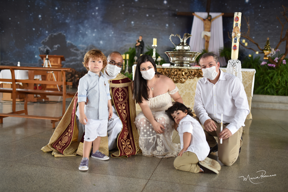 Sempre muito jeitoso com as crianças, Padre Fabiano Roberto fez um lindo batizado de Otávio Rocha Idaló, ao lado de Mateus, Bernardo, Dayana e Samir Idaló