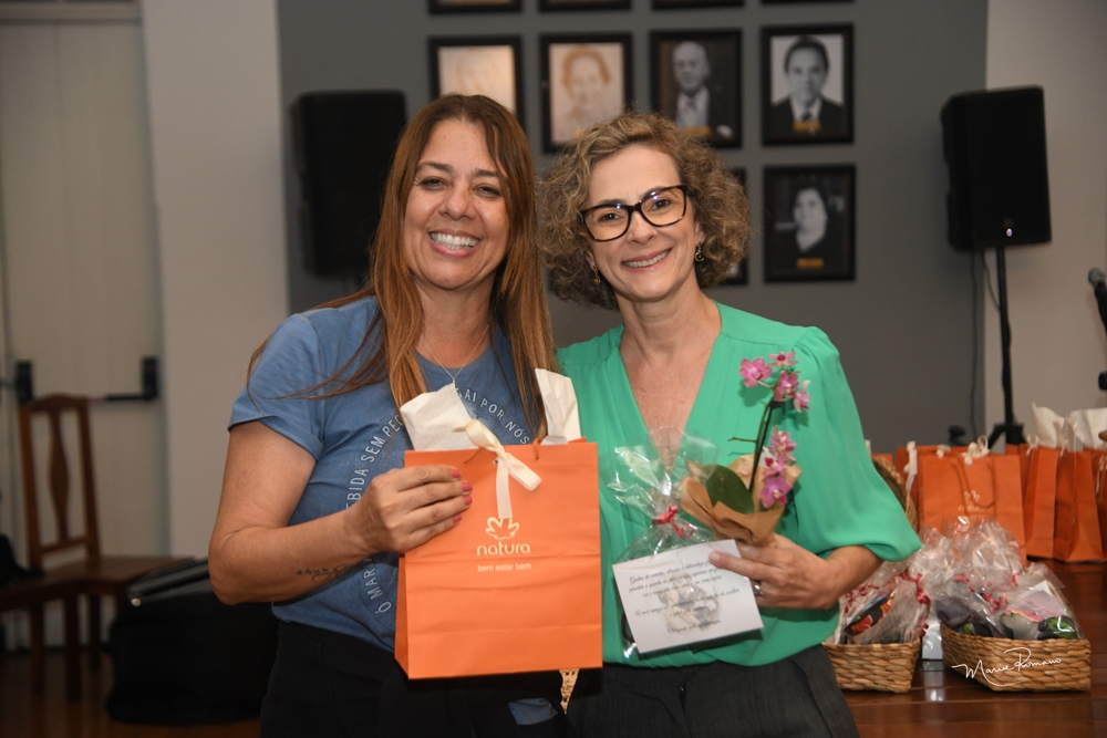 Claudia Siqueira ofereceu flores em nome do Asilo Santo Antônio a Elaine Furtado por belo trabalho de arquitetura e decoração.