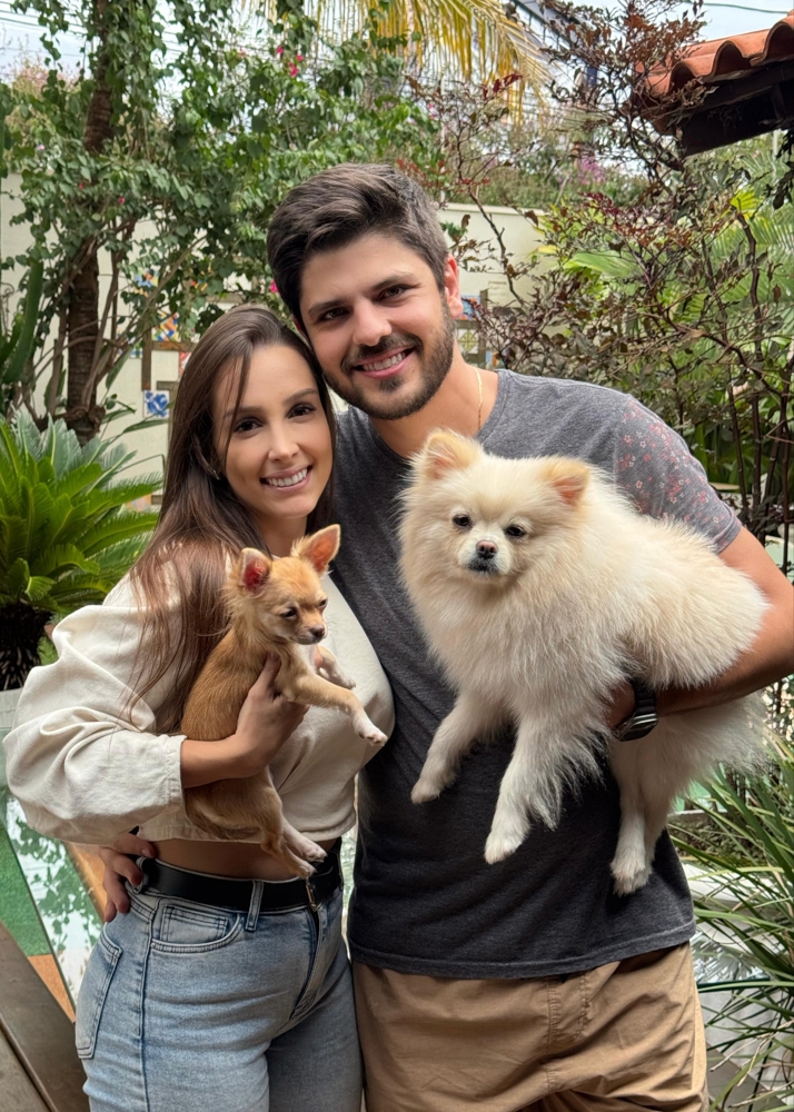 Thayná Galoro e Caio Romano curtem as brincadeiras das filhinhas de 4 patas Malu e Jolie.