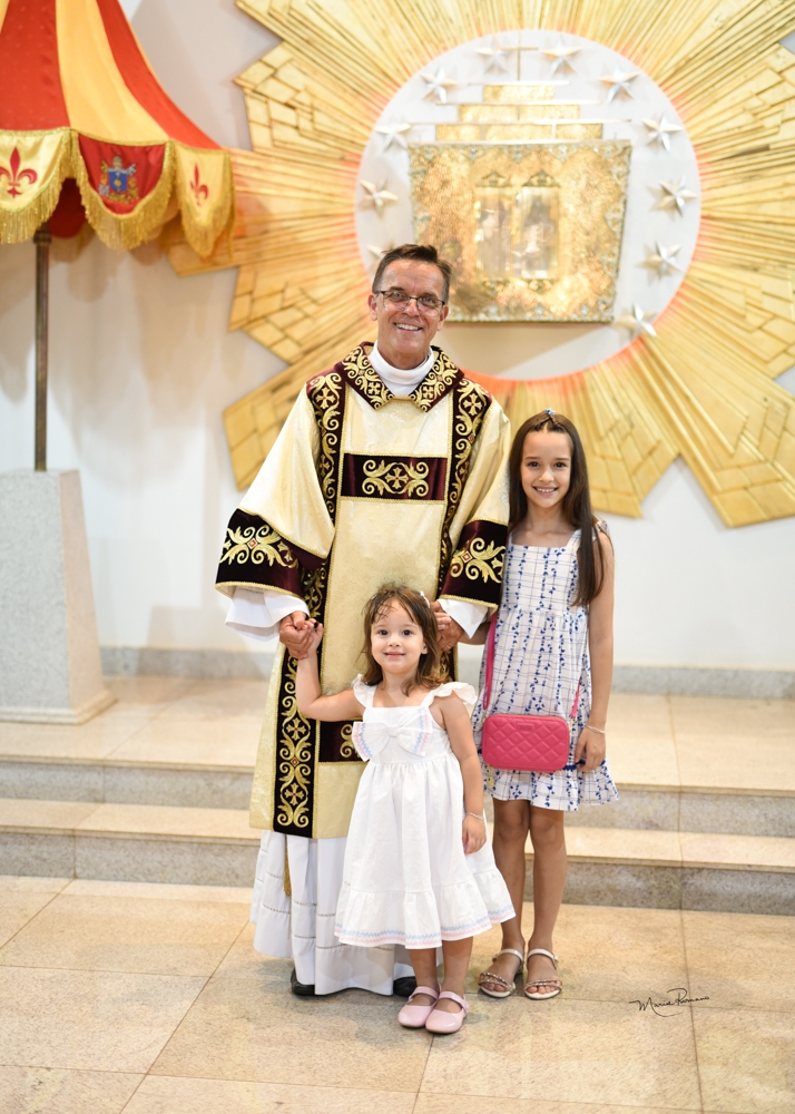 Júlia e Lívia fizeram a foto oficial com o diácono Francisco, na basícia de Sacramento onde atua o Padre Ricardo Fidelis, que foi da nossa Medalha Milagrosa por muitos anos.