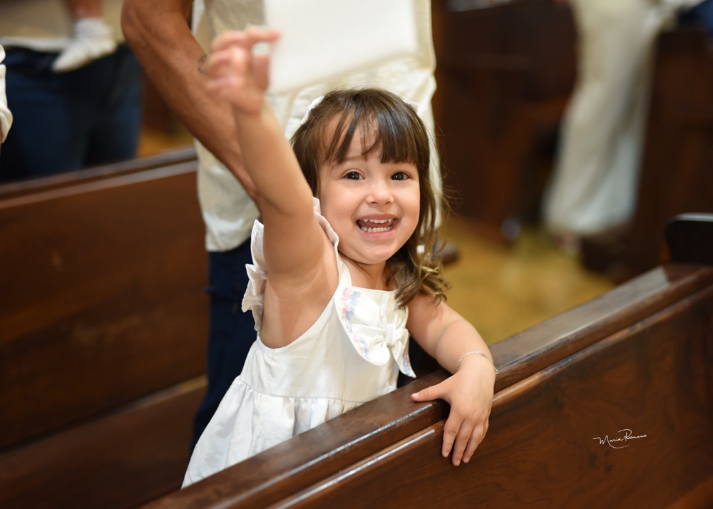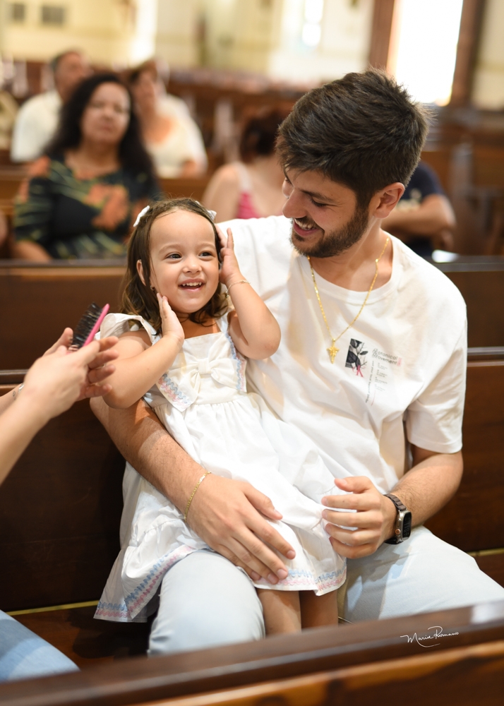 Muito alegre no colo do padrinho Caio Romano, Lívia amou receber o sacramento do batismo e queria ganhar água benta de novo.