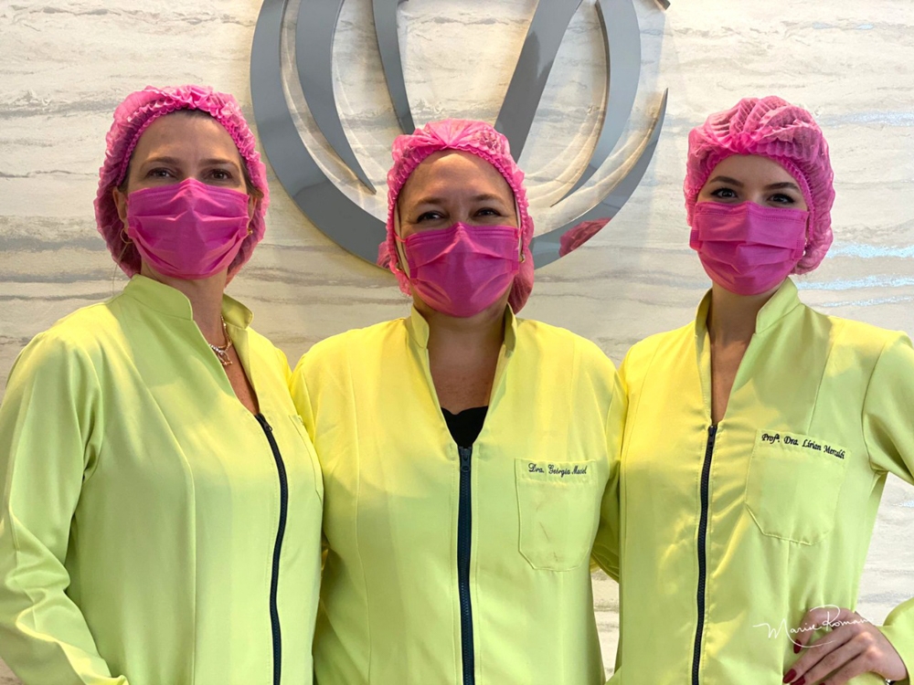 As professoras do curso de Harmonização Orofacial Lara Sorpreso, Geórgia Maciel e Lírian Maraldi comemoram os resultados positivos dos alunos