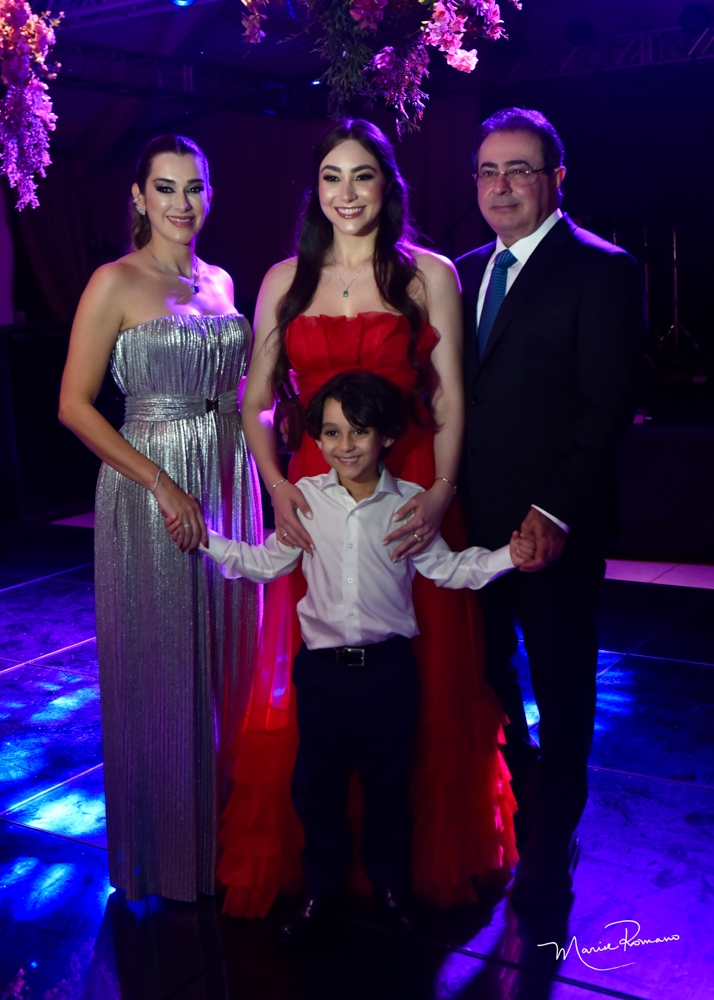 Victória recebeu seus convidados ao lado de Luciana Velasco Rufato Saad, Kaissor Saad e Kaissor Velasco Saad.