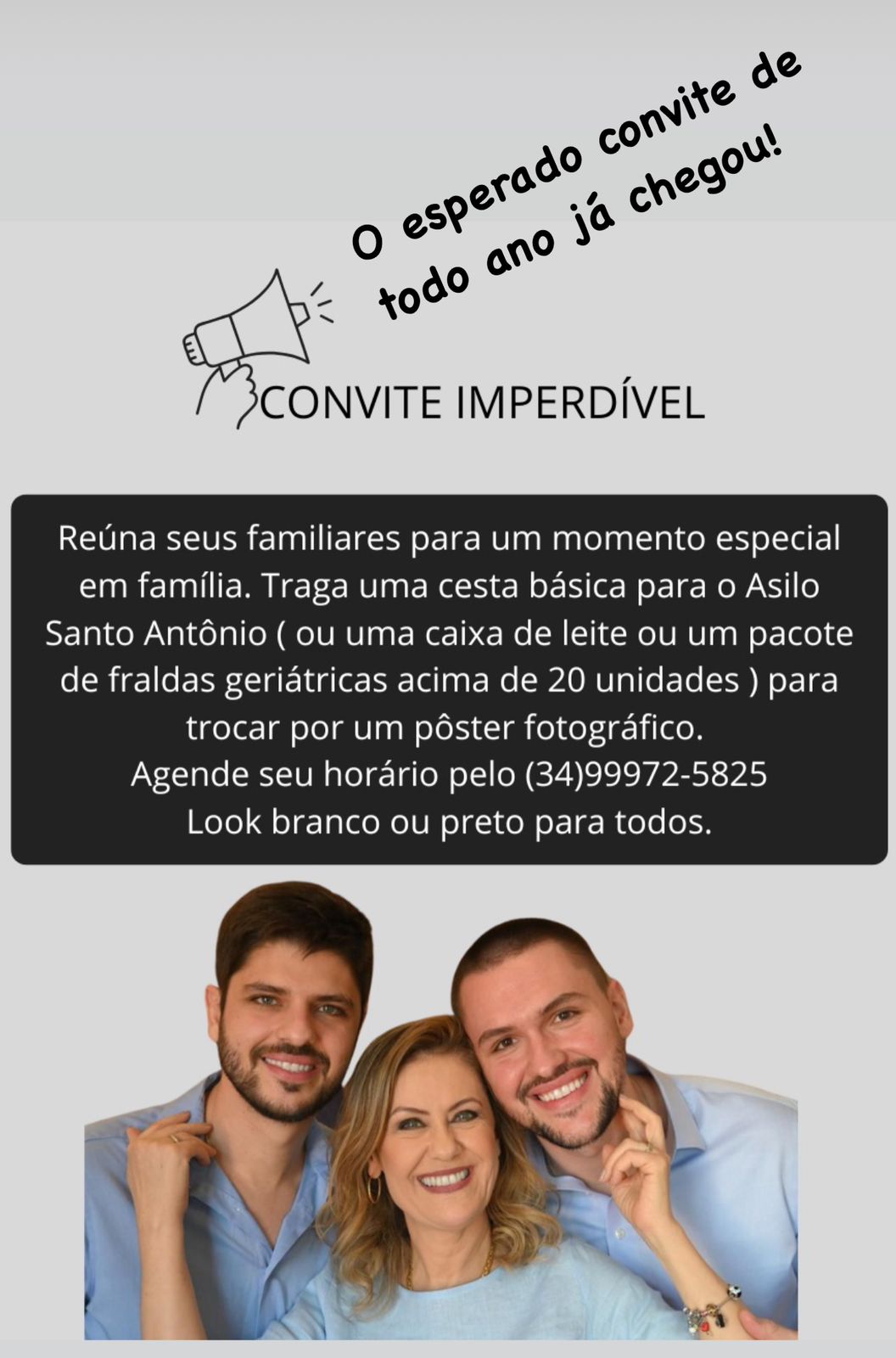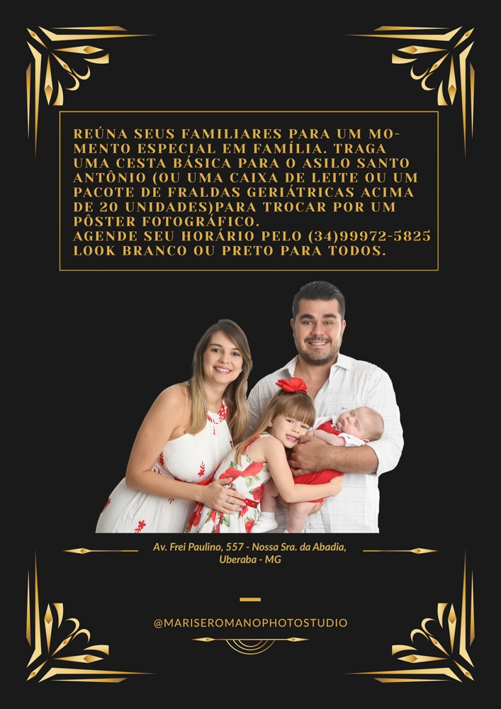 François Ramos, Leilane Virginia Penariol e Lavínia Penariol Ramos participam da campanha que apoia o Asilo Santo Antônio para o dia da família.