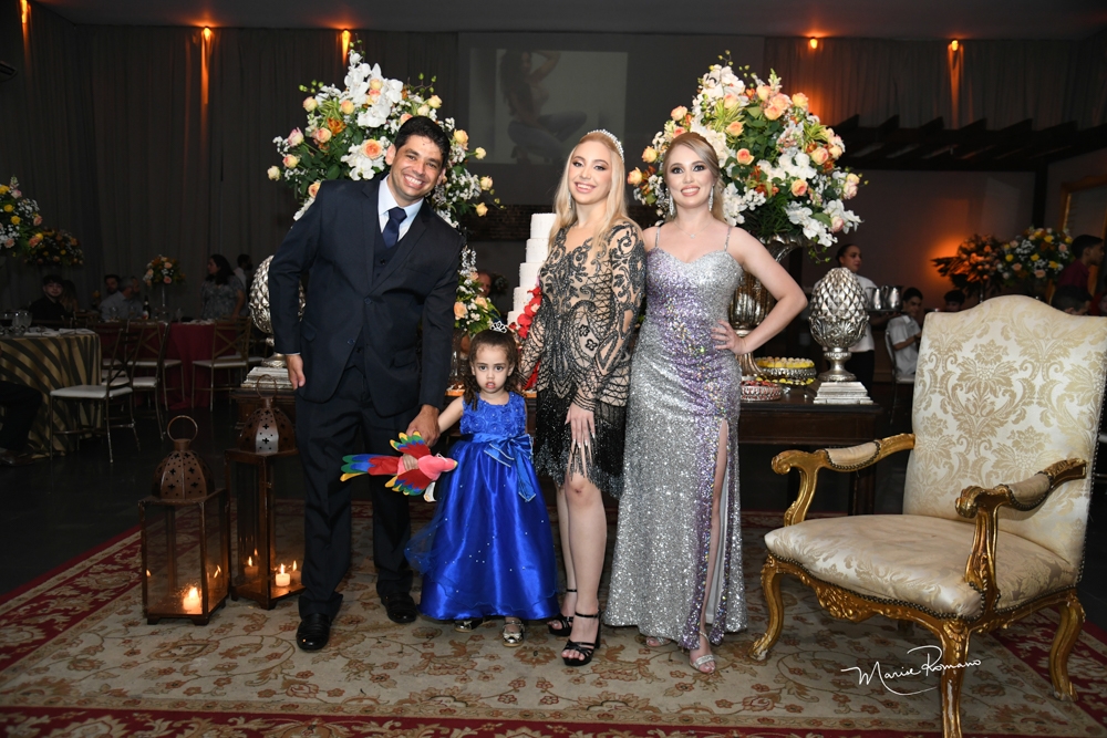 Isabella Maria Castro Castelar com sua irmã Alice e seus pais Liliane e Gustavo Castelar gostaram muito da festa no Le Castelly Buffet