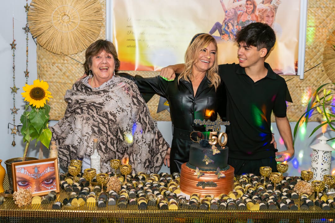 Micheline Facure ouviu os Parabéns a Você abraçada pela mãe Miriam e pelo filho Arthur