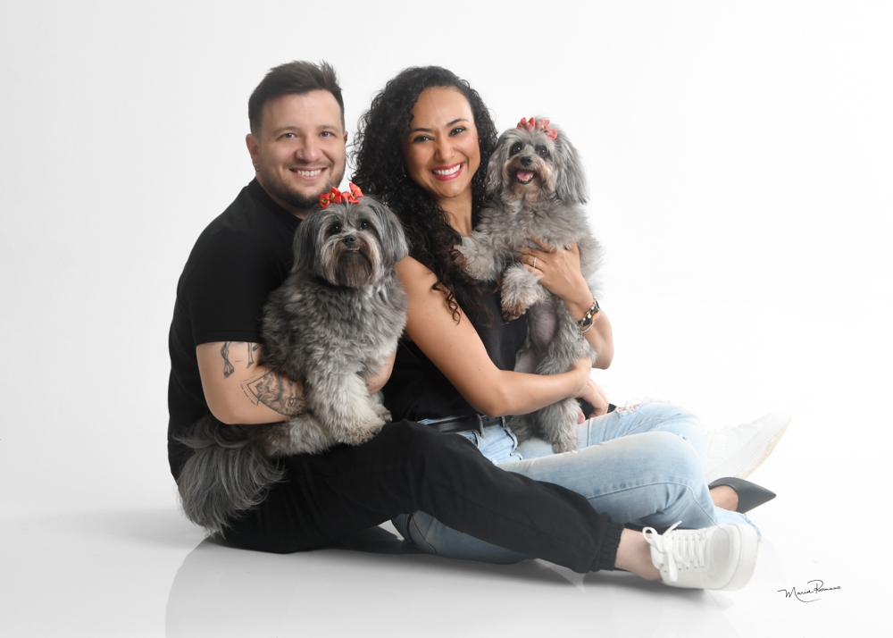 Caroline Freitas Silveira e Matheus Dário Andreoli com as pets Majú e Jovelina enfeitam a coluna social de hoje