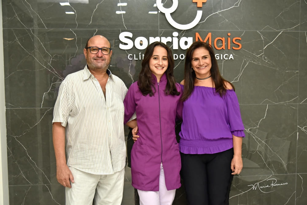 A dentista Stefânia França Reis recebeu com alegria seus pais Adriana e Isauro Reis na inauguração da clínica Sorria Mais, no dia 27 de setembro