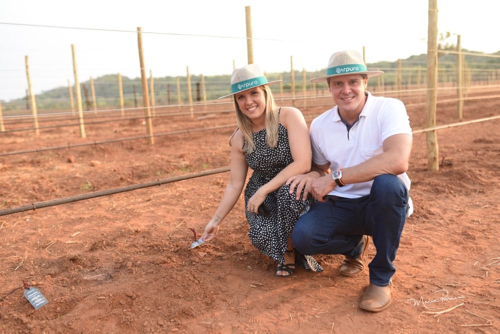 A prefeita de Uberaba Elisa Araújo e seu esposo Juliano Arantes fizeram o plantio de uma das mudas de uvas da primeira vinícola da região, a Arpuro