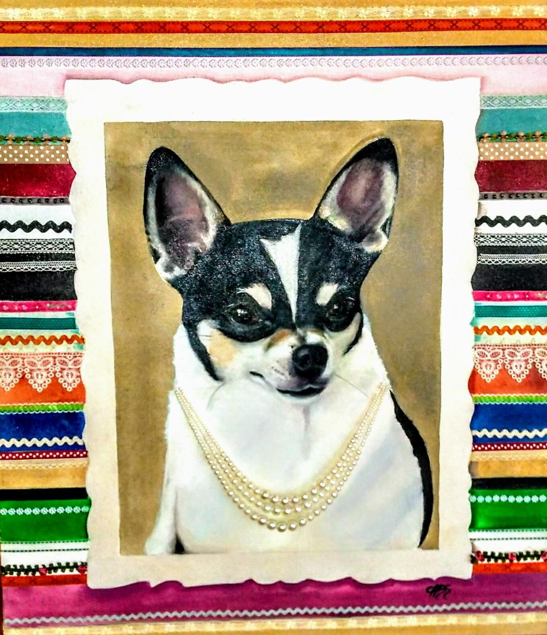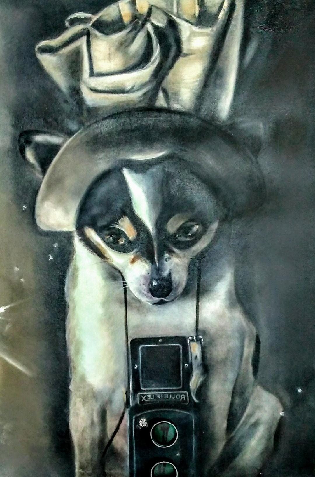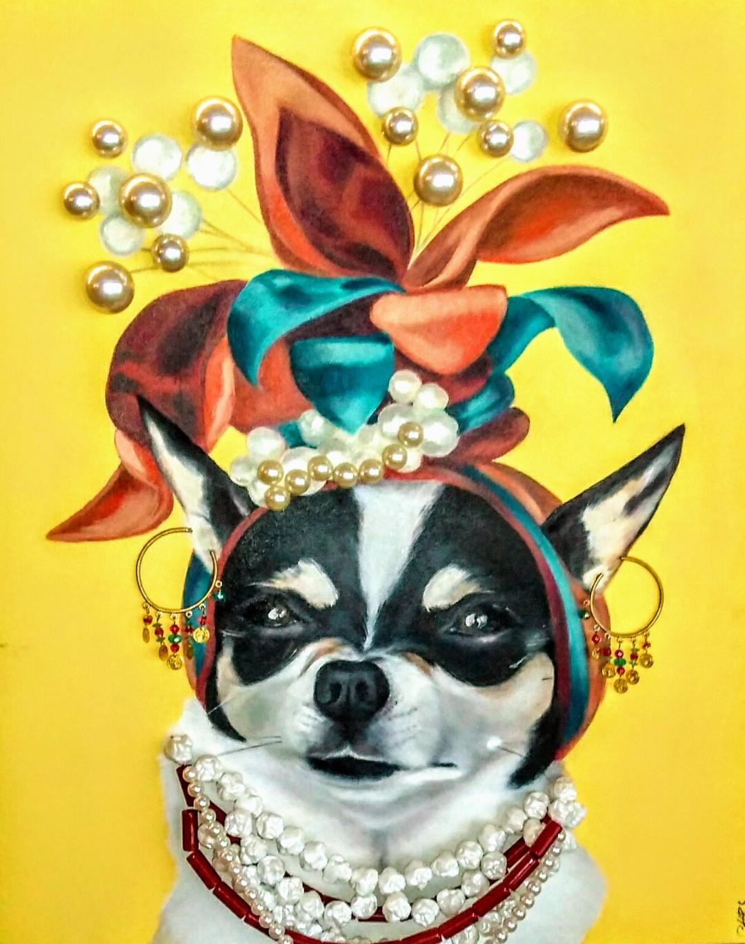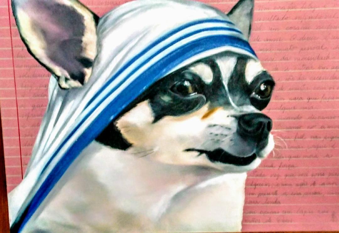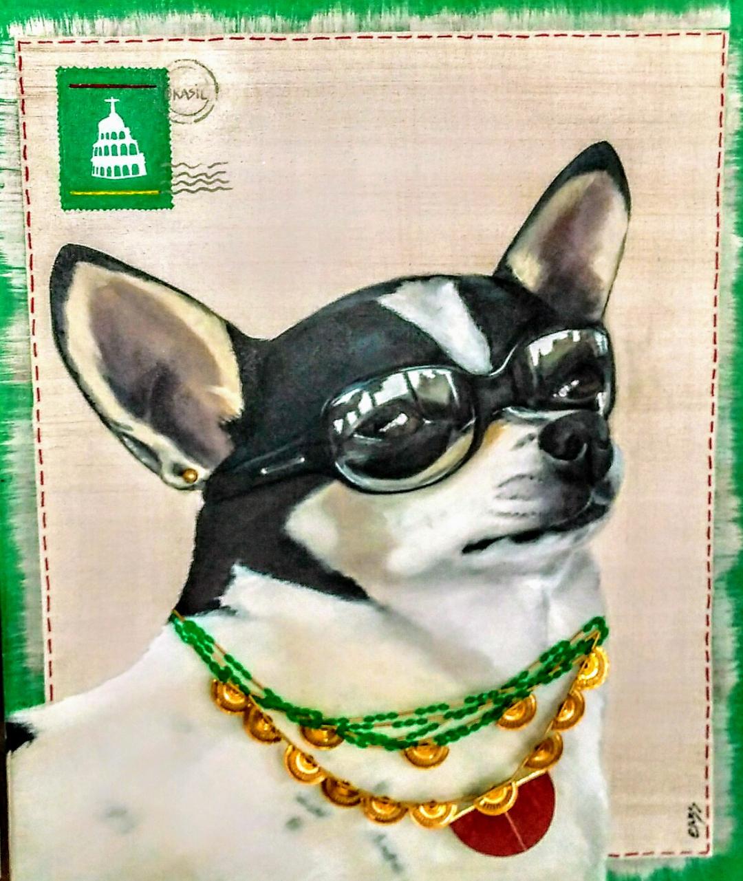 A inspiração, veio da cadelinha Chihuahua Chanel que foi imortalizada nas telas. Nos chama a atenção pela expressão do olhar ao fazer as homenagens.