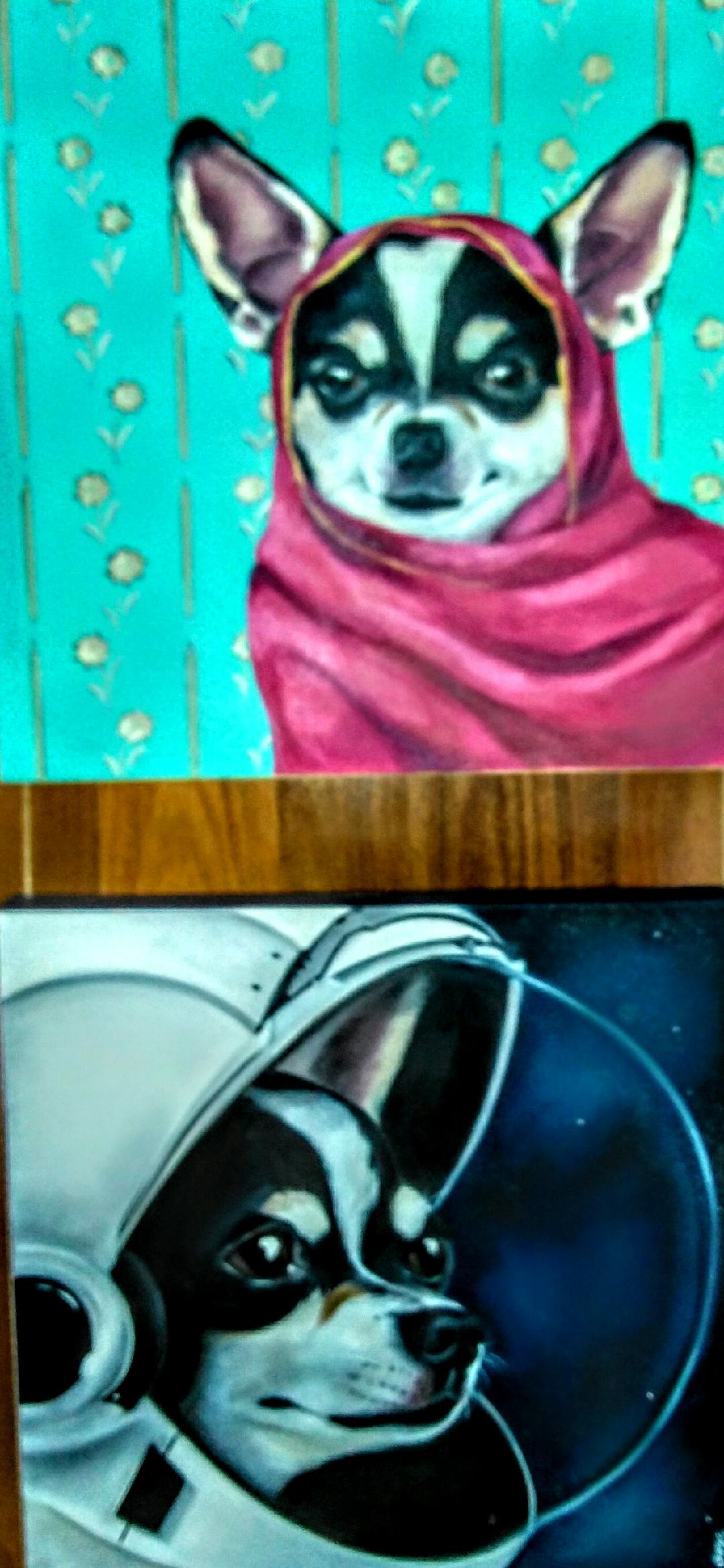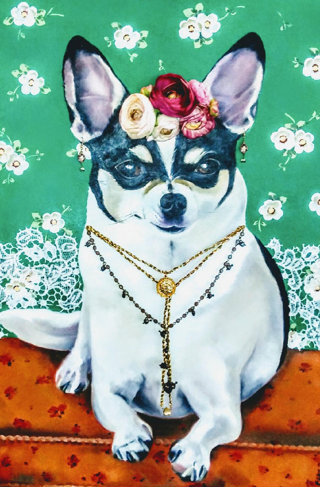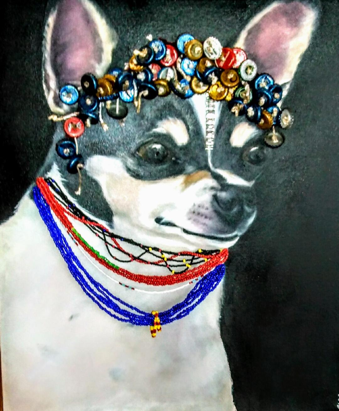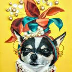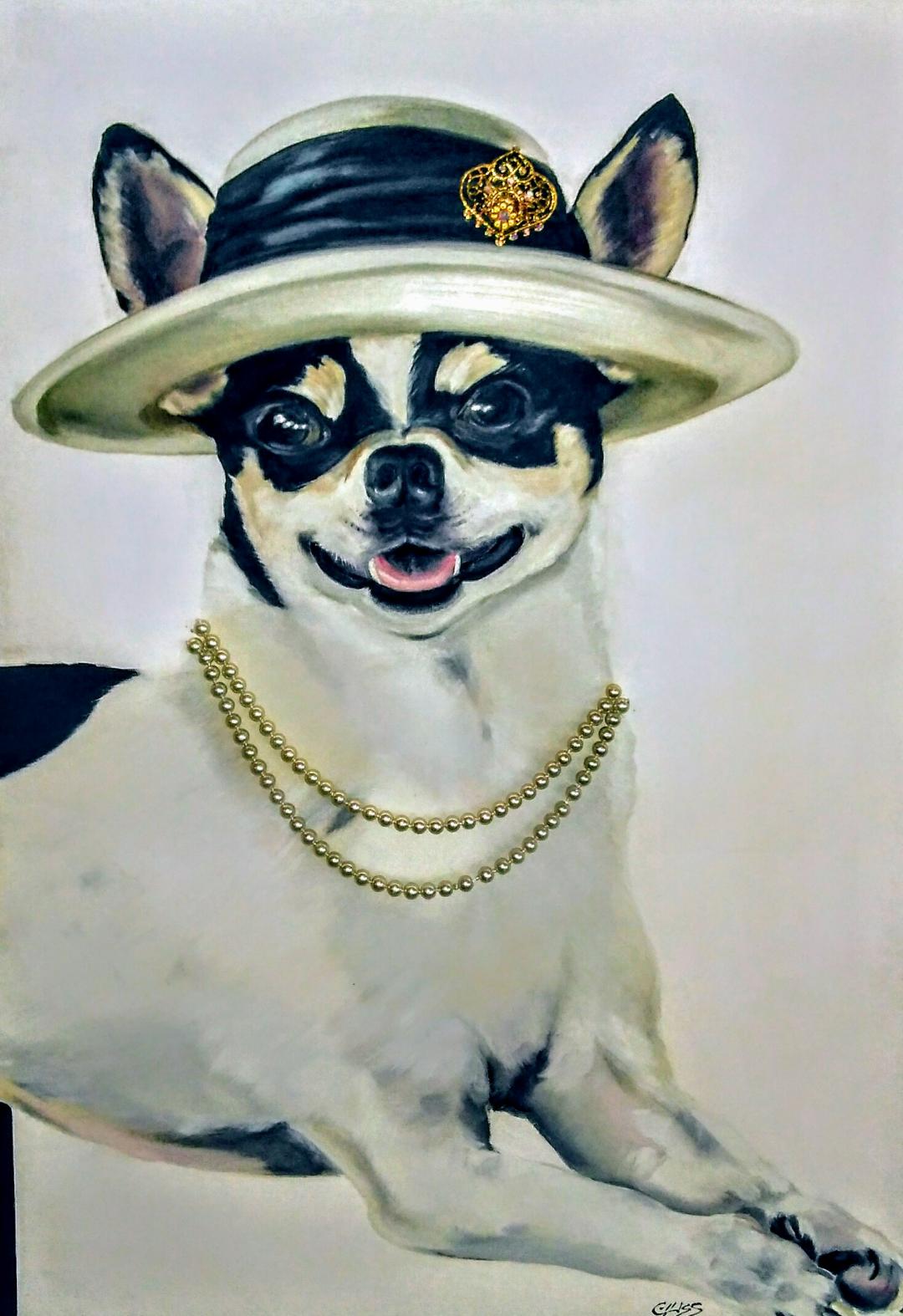 A inspiração, veio da cadelinha Chihuahua Chanel que foi imortalizada nas telas. Nos chama a atenção pela expressão do olhar ao fazer as homenagens.