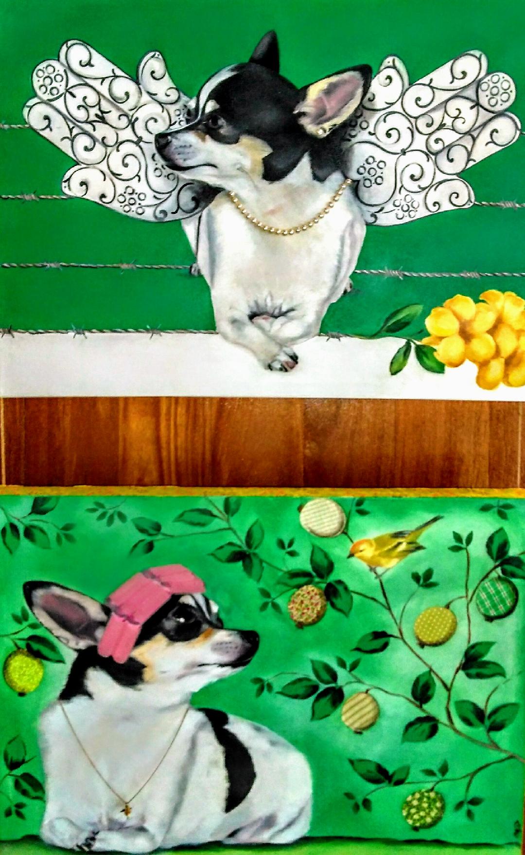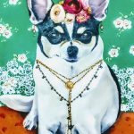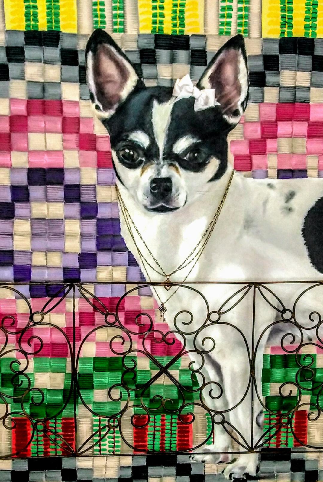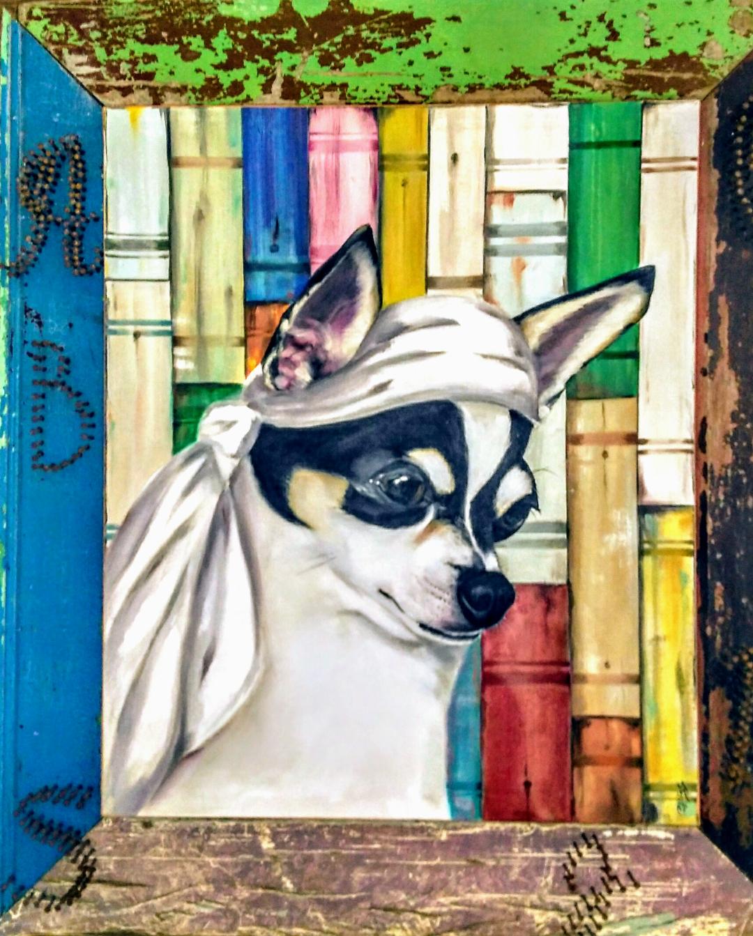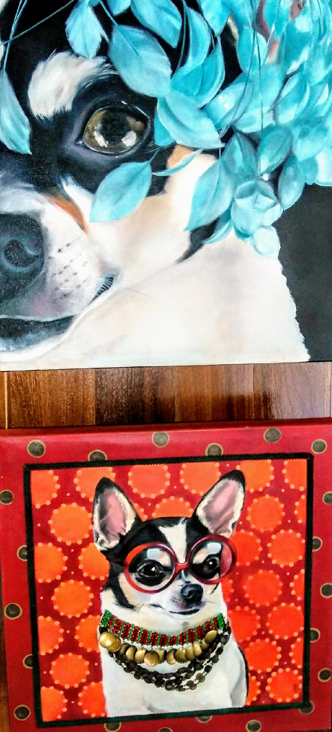 A inspiração, veio da cadelinha Chihuahua Chanel que foi imortalizada nas telas. Nos chama a atenção pela expressão do olhar ao fazer as homenagens.