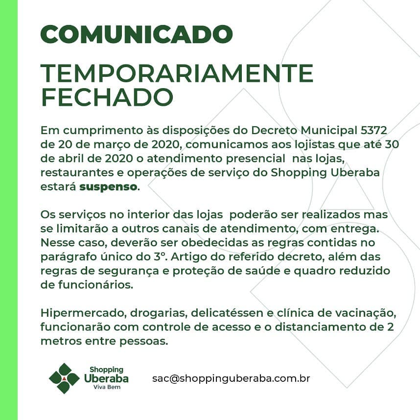 Em cumprimento às disposições do Decreto Municipal 5372 de 20 de março de 2020, comunicamos aos lojistas que até 30 de abril de 2020 o atendimento presencial nas lojas, restaurantes e operações de serviço do Shopping Uberaba estará suspenso.